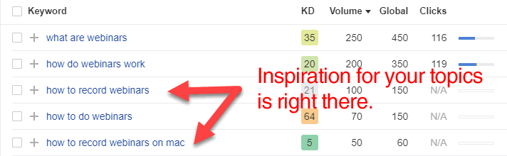 Start with your favorite SEO reporting tool for keyword research, like Ahrefs or Moz, and enter a word or phrase that’s relevant to what you do. For instance, if we take the topic “webinars”. Some poking around in Ahrefs will give you very interesting insights.