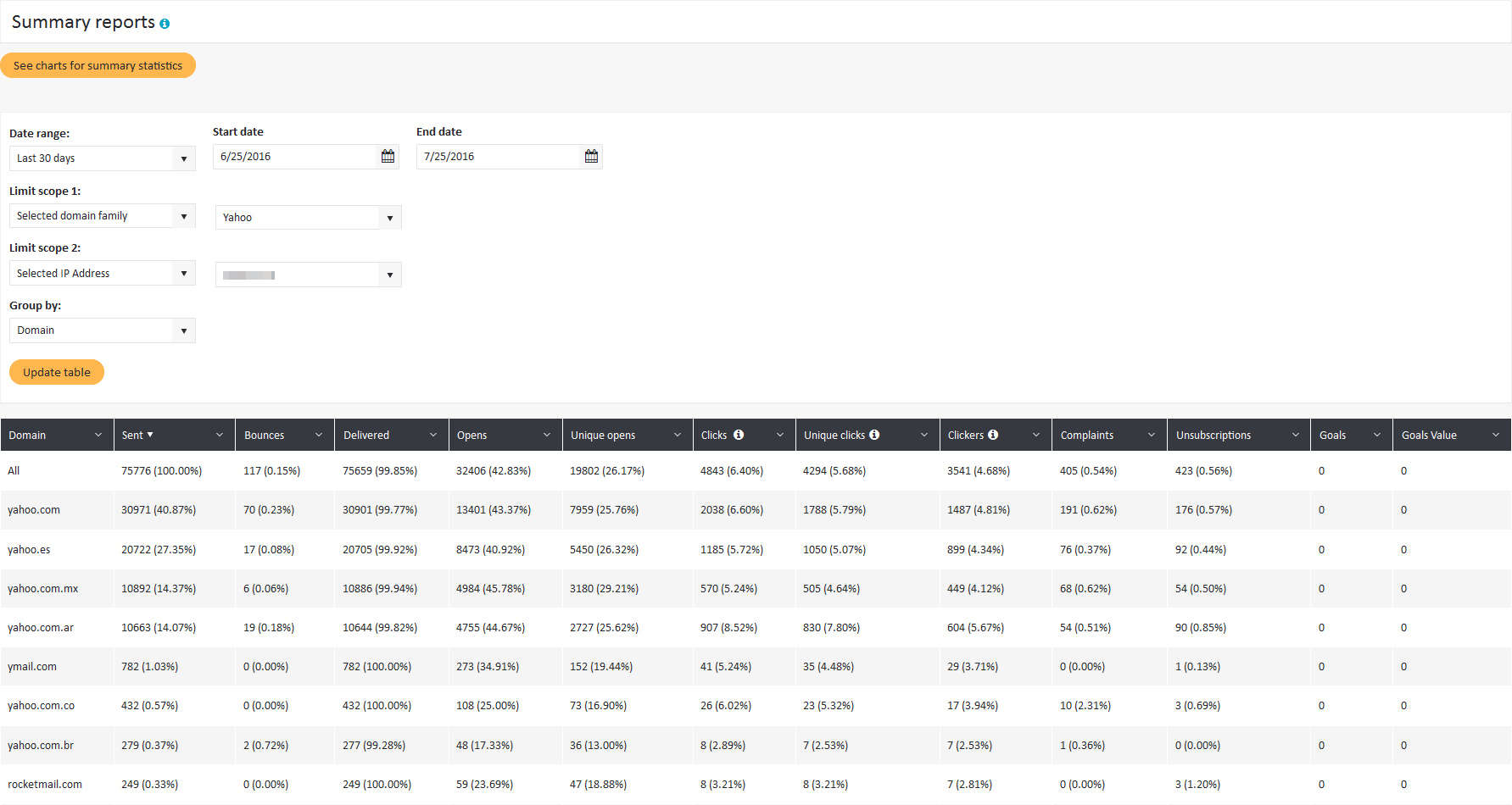 Some ESPs can group domain families and break down the deliverability performance per specific IP addresses. For example, see the Outlook domains below. Or Yahoo, which owns yahoo.com, ymail.com, rocketmail.com.