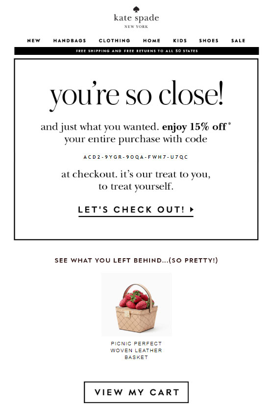 Here’s an email automation example of a very well-crafted cart recovery email sequence in the fashion email marketing automation from retailer Kate Spade New York. As soon as the customer abandoned their shopping cart, the cart abandonment email is sent in the email is the product they were originally interested in: