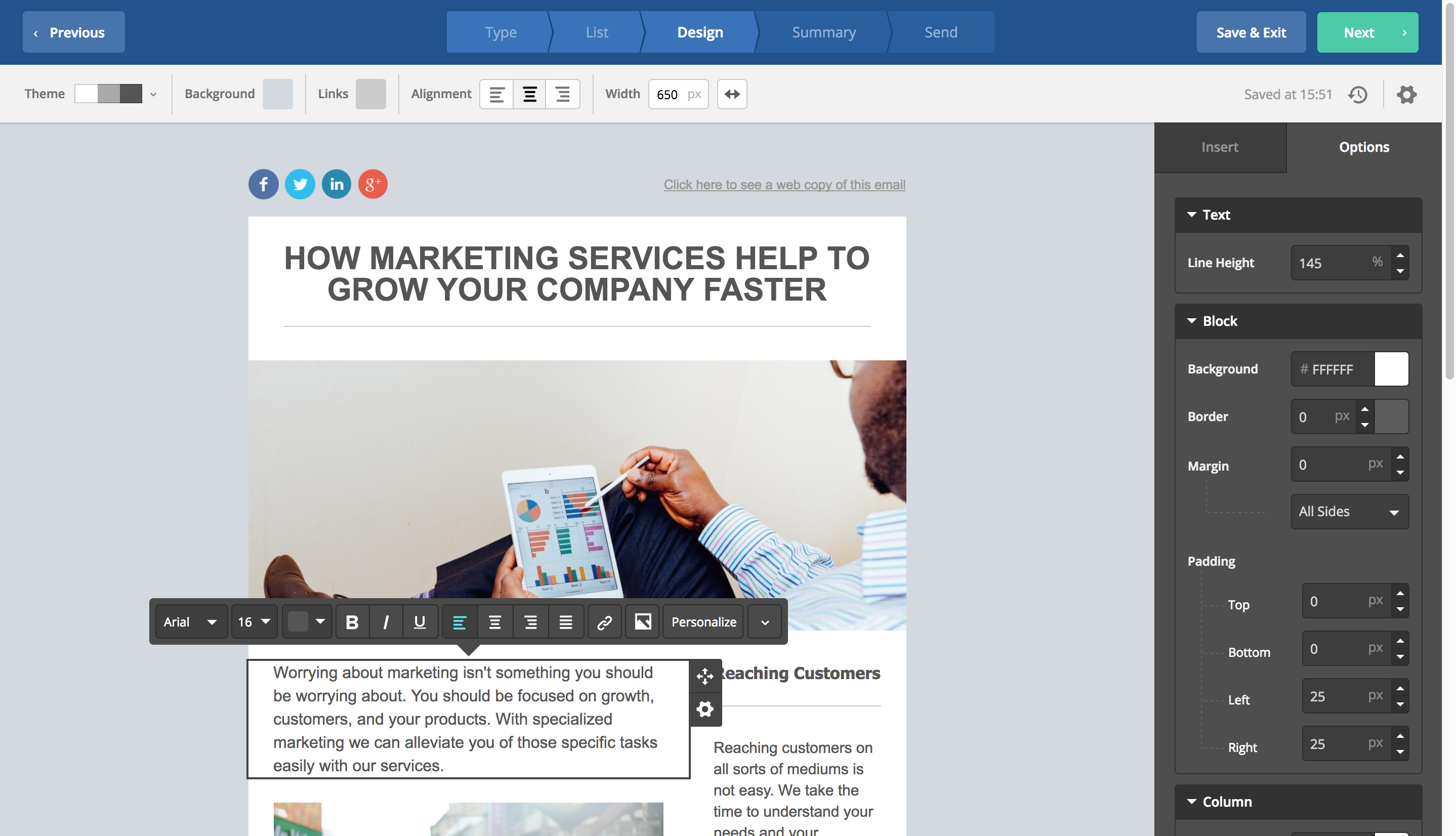 ActiveCampaign designed templates are fully mobile responsive. You can use tools like content blocks to save and reuse piece of content across campaigns.