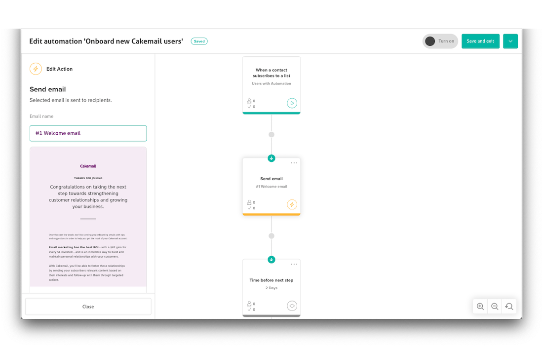 Cakemail’s automation builder makes it easy to automatically send a welcome email or a series of onboarding emails to new mailing list subscribers.