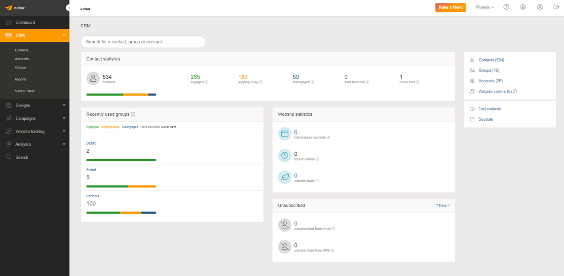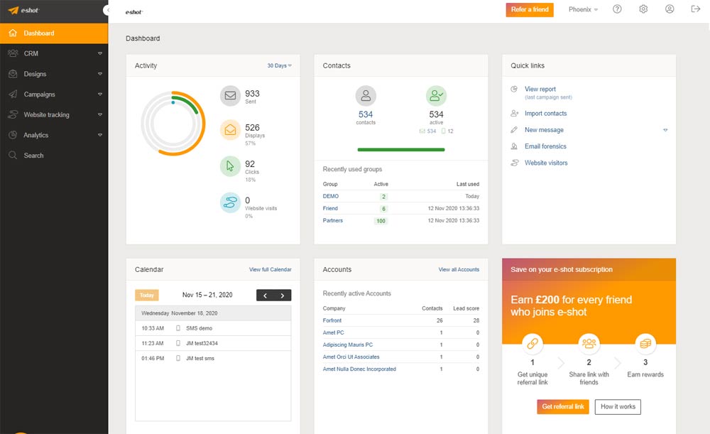 Fully integrated SMS service visible from the e-shot dashboard, can deliver granular reporting individual contact’s email and SMS engagement.
