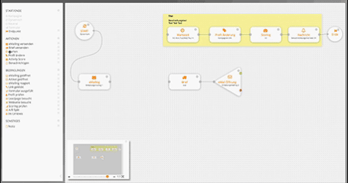 You can use Campaign Designer in Evalanche to easily create automated campaigns. The Campaign Designer combines business process management methodologies and object configuration in Evalanche. With the campaign module, you can use the drag-and-drop function to configure the individual modules based on your desired processes. With the configuration menu, you can quickly create comprehensive campaigns and run them in a fully automated fashion.