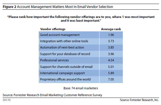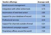 It becomes more interesting when the marketers rank the different vendor offerings by importance. Good account management is at the top of the list for these enterprise email marketers. Second is the integration with other online tools, and third is the automation of next-best action. Proprietary offices around the world is deemed least important, but not all email marketers surveyed work for an international company.