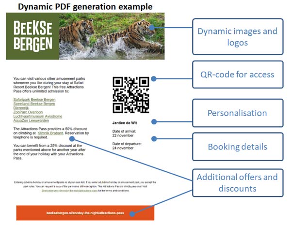 - Laat de transactionele e-mailprovider de PDF genereren. Net als je transactionele e-mail genereer je een stuk code die omgezet wordt tot PDF (XHTML). Je voedt het template met de benodigde data, geeft er wat schwung aan in jouw huisstijl en – voilà – je hebt volledig gepersonaliseerde, strak opgemaakte PDF bijlagen die je vanuit dezelfde software verstuurt. Dat scheelt weer een aantal koppelingen en data-synchronisatie.
