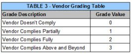 The grading of vendors is done by assigning values for those that don’t comply (zero), these that comply partially (1), those that comply fully (2) and the ones that comply above and beyond (3).