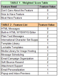 Finally, you will want to create a table that has features listed horizontally and vendors vertically where the intersection of vendor x feature is the place for the score. See below and note that we have prepared a scoring matrix in Excel for you to use and save you some typing time.