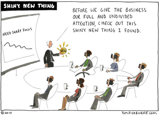 All of that said, be sure you are looking to the future too. If your plans over the next 12 to 24 months do require a functionality you don’t require right now, it could it’s not a shiny thing after all, but a functionality you really do need. Still, insist on ownership and accountability for it. Just because you buy it doesn’t mean they will use it…even if they said they would.