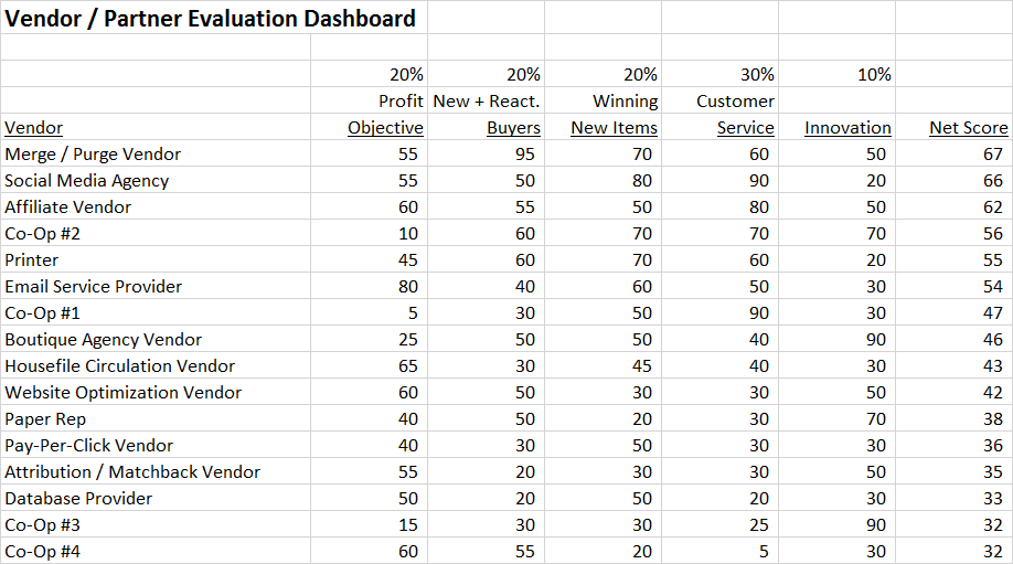 Look at the Database Provider row. This vendor houses the customer database for a client. This vendor is not helping my client increase new + reactivated buyers, this vendor is not providing great customer service, and this vendor is not innovating. As a result, the Database Provider earns a score of thirty-three (33). This vendor is at the bottom of the table.